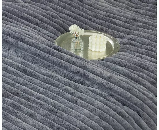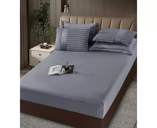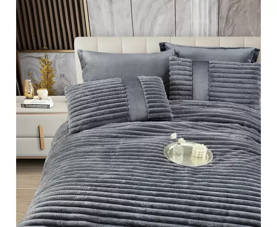 Lenjerie de Pat cu Pilota Inclusa , Cearceaf cu Elastic, 6 Piese, Blană de Iepure Artificială- JO867 Gri Inchis