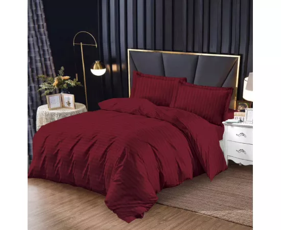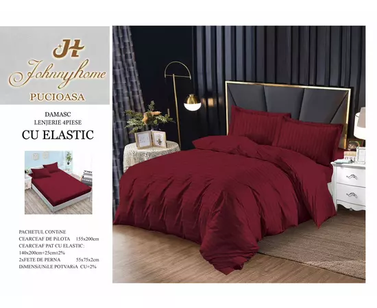 Lenjerie de Pat Damasc, 1 Persoana, 4 Piese cu Elastic, Bordo - SIPRg-02