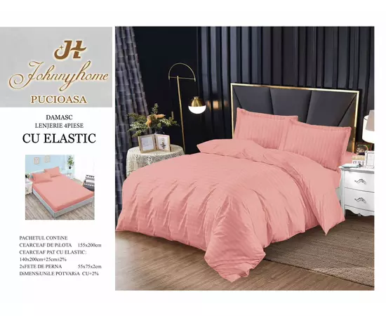 Lenjerie de Pat Damasc, 1 Persoana, 4 Piese cu Elastic, Roz - SIPRg-14