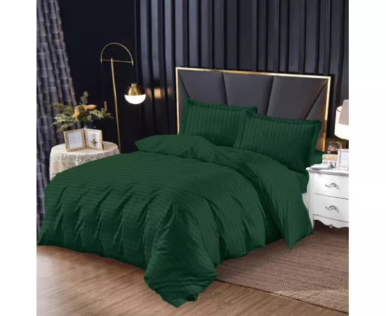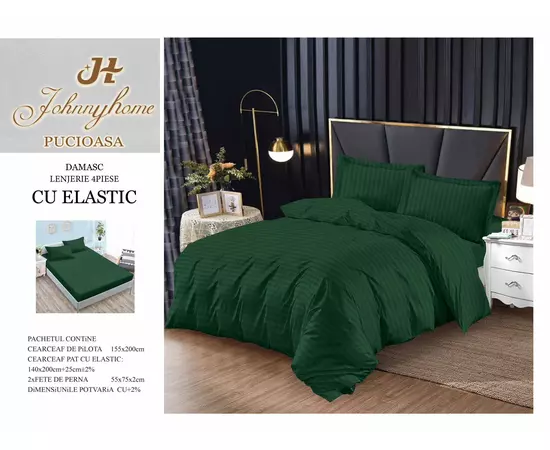 Lenjerie de Pat Damasc, 1 Persoana, 4 Piese cu Elastic, Verde Inchis - SIPRg-04
