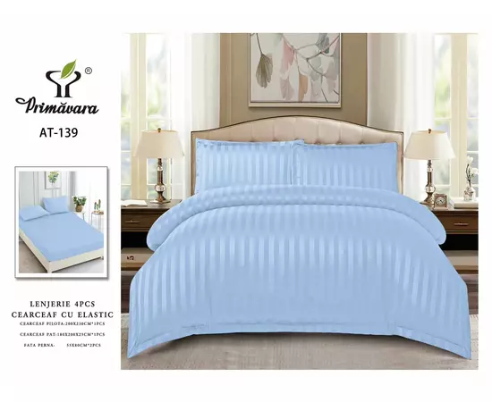 Lenjerie de Pat Dublu Bumbac Damasc 4 Piese cu Elastic, Bleu - CPL12