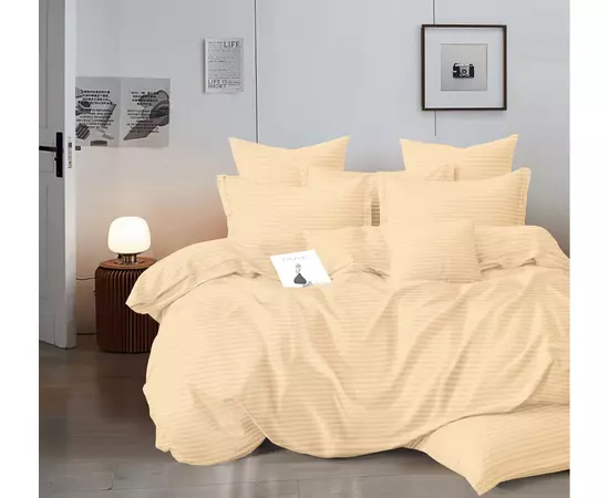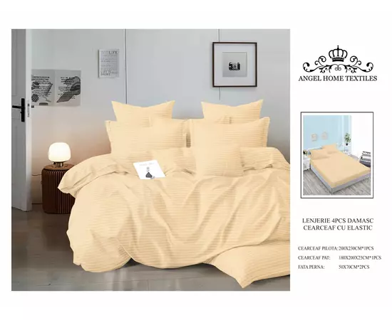Lenjerie de Pat Dublu Bumbac Damasc 4 Piese cu Elastic, Crem - XIA171