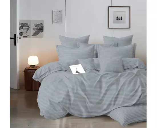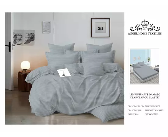 Lenjerie de Pat Dublu Bumbac Damasc 4 Piese cu Elastic, Gri Deschis - XIA176