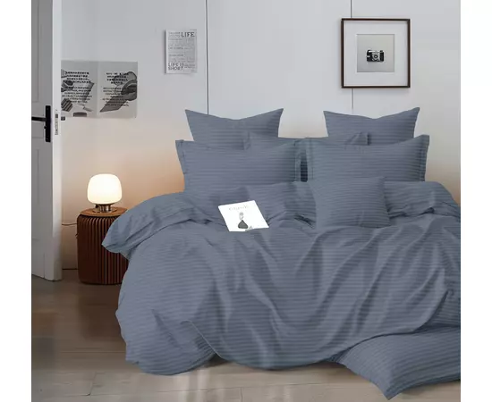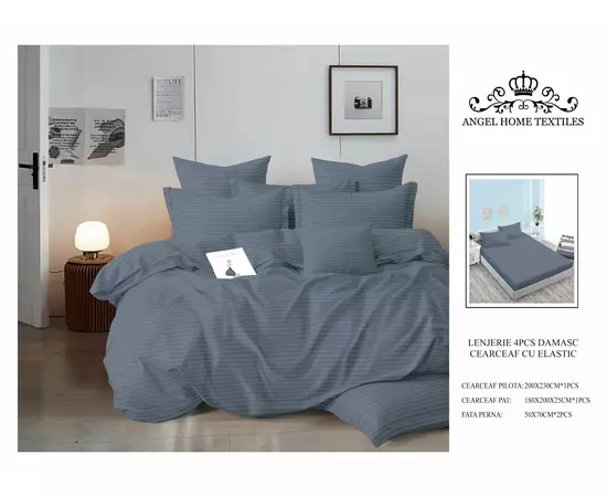 Lenjerie de Pat Dublu Bumbac Damasc 4 Piese cu Elastic, Gri Inchis - XIA177