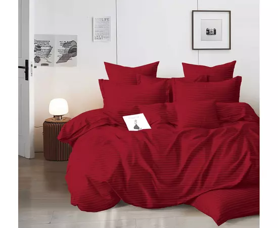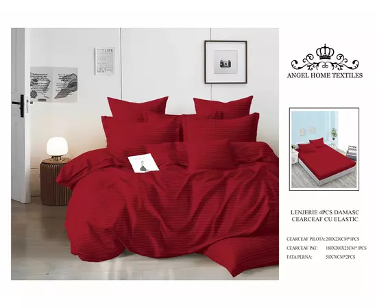 Lenjerie de Pat Dublu Bumbac Damasc 4 Piese cu Elastic, Visiniu - XIA180