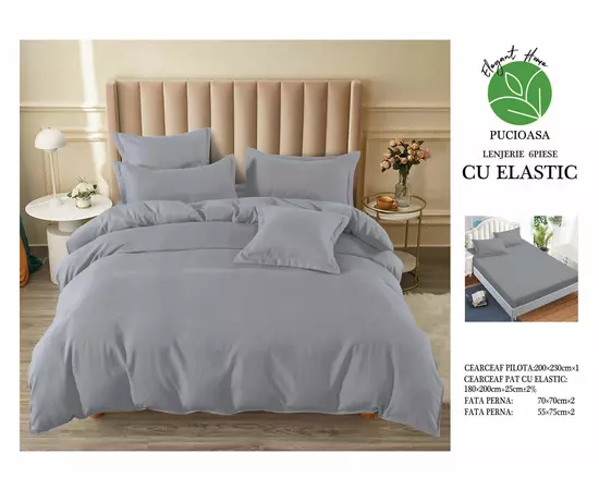 Lenjerie de pat dublu Bumbac Finet 6 Piese cu Elastic, Gri- SIPRT186