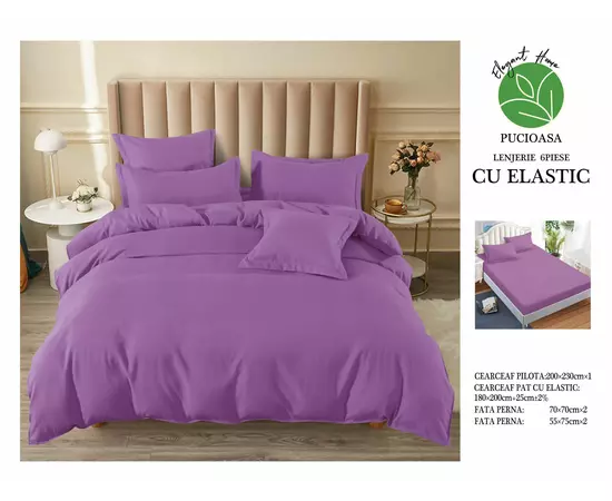 Lenjerie de pat dublu Bumbac Finet 6 Piese cu Elastic, Mov- SIPRT183