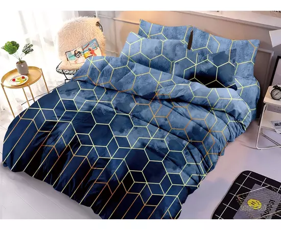 Cu dimensiunile specifice pe care le-ați furnizat, lenjeria de pat dublu din bumbac finet cu forme geometrice arată astfel: