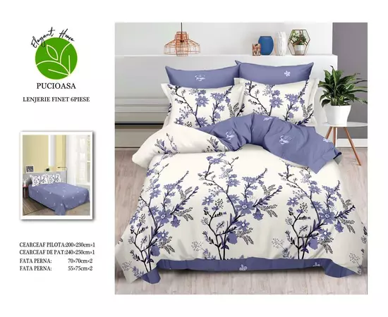 Materialul din care este confectionata lenjeria este bumbac finet, gros, de calitate superioara cu o textura fina, moale si foarte placuta la atingere.