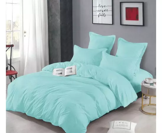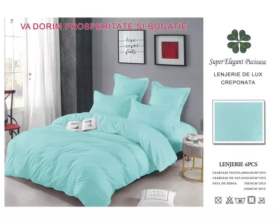 Lenjerie de Pat Dublu, Bumbac Finet-Creponat, 6 Piese, Azuriu-LJ1099