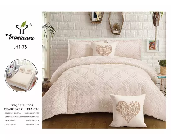 Lenjerie de Pat Dublu, Bumbac Finet-Creponat, 6 Piese, Crem Deschis - CPL18