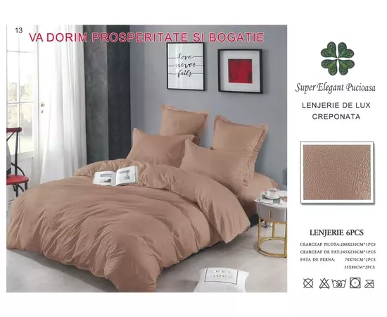 Material creponat, plăcut la atingere, nu aluneca de pe pat, nu se sifoneaza, nu intră la apă şi nu se decolorează.