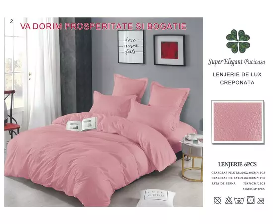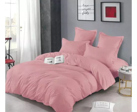 Lenjerie de Pat Dublu, Bumbac Finet-Creponat, 6 Piese, Roz pudra- LJ1094