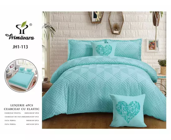 Lenjerie de Pat Dublu, Bumbac Finet-Creponat, 6 Piese, Turcoaz - CPL23