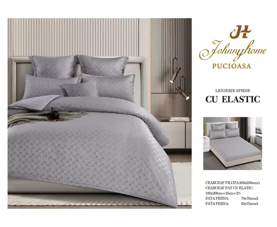 Aceasta lenjerie pentru pat dublu cu 6 piese prezinta un design modern raportat la tendintele actuale ale pietei, iar culorile rafinate reprezinta alegerea perfecta pentru esteticul reusit al dormitoritorului dumneavoastra. Transforma-ti dormitorul cu aceasta lenjerie superba!
