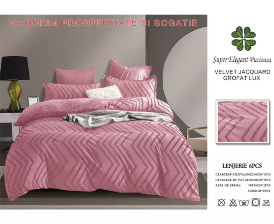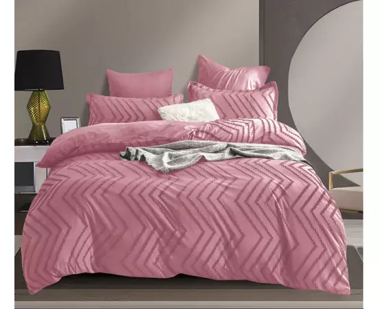 Lenjerie de Pat Finet Jacquard Velvet Gofrat, Pat Dublu, 6 Piese, ROZ - PUC118