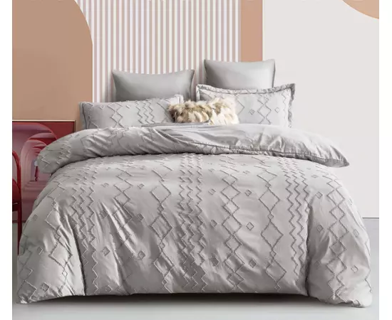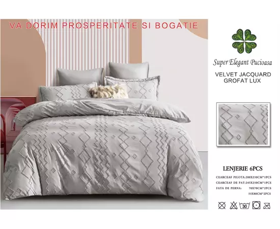 Lenjerie de Pat Finet Jacquard Velvet Gofrat, pentru Pat Dublu, 6 Piese, GRI - PUC112