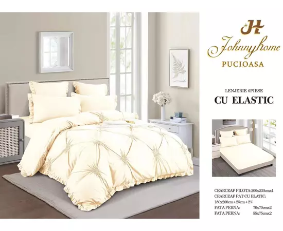 Lenjeria de pat finet cu pliuri brodate și elastic, formată din șase piese, reprezintă un amestec perfect între eleganță, confort și funcționalitate. Fiecare aspect al acestei lenjerii este meticulos proiectat pentru a aduce o notă de rafinament și lux în dormitorul dvs.