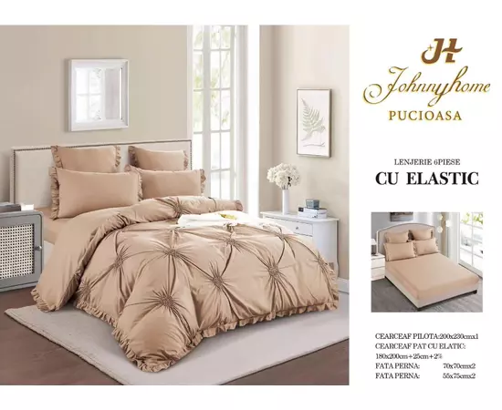 Lenjeria de pat finet cu pliuri brodate și elastic, formată din șase piese, reprezintă un amestec perfect între eleganță, confort și funcționalitate. Fiecare aspect al acestei lenjerii este meticulos proiectat pentru a aduce o notă de rafinament și lux în dormitorul dvs.