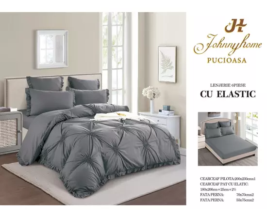 Lenjeria de pat finet cu pliuri brodate și elastic, formată din șase piese, reprezintă un amestec perfect între eleganță, confort și funcționalitate. Fiecare aspect al acestei lenjerii este meticulos proiectat pentru a aduce o notă de rafinament și lux în dormitorul dvs.