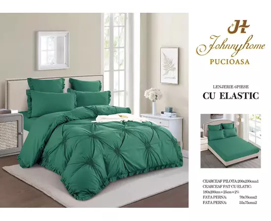 Lenjeria de pat finet cu pliuri brodate și elastic, formată din șase piese, reprezintă un amestec perfect între eleganță, confort și funcționalitate. Fiecare aspect al acestei lenjerii este meticulos proiectat pentru a aduce o notă de rafinament și lux în dormitorul dvs.