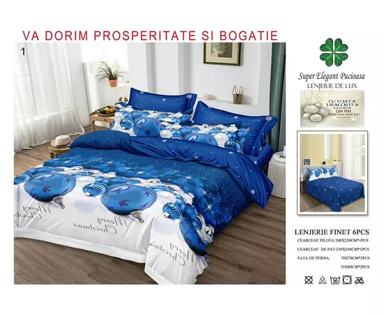 Lenjerie Pat cu 6 piese Bumbac Finet, Model de Craciun - PUC165