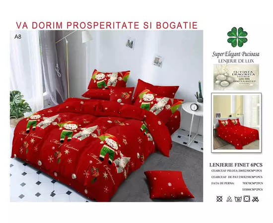 Lenjerie Pat cu 6 piese Bumbac Finet, Model de Craciun - PUC185