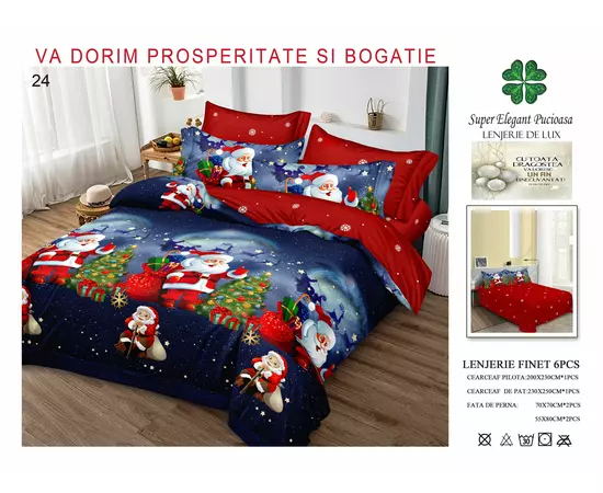 Lenjerie Pat cu 6 piese Bumbac Finet, Model de Craciun - PUC190