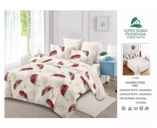 Lenjerie de Pat pentru 2 persoane cu 6 piese confectionata din Bumbac Finet.