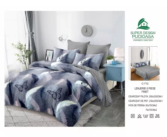 Lenjerie de Pat pentru 2 persoane cu 6 piese confectionata din Bumbac Finet.