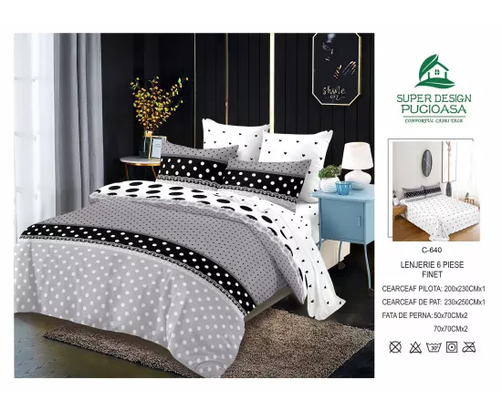 Lenjerie de Pat pentru 2 persoane cu 6 piese confectionata din Bumbac Finet.