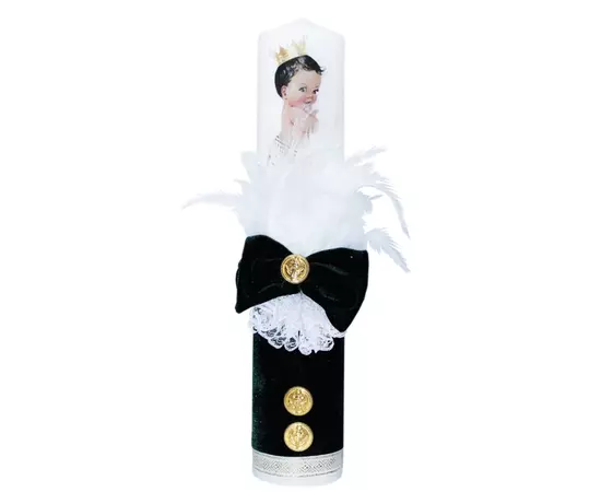 Alege o lumanare de botez cu aplicatii din pene, catifea si funda stil papion aplicata. In timpul slujbei religioase, unul dintre nasi va tine lumanarea aprinsa, flacara lumanarii simbolizand drumul pe care si-l va alege in viata copilasul.