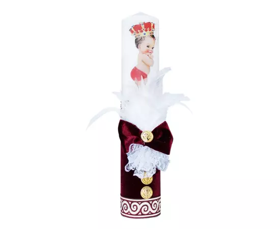 Alege o lumanare de botez cu aplicatii din pene, catifea si funda stil papion aplicata. In timpul slujbei religioase, unul dintre nasi va tine lumanarea aprinsa, flacara lumanarii simbolizand drumul pe care si-l va alege in viata copilasul.