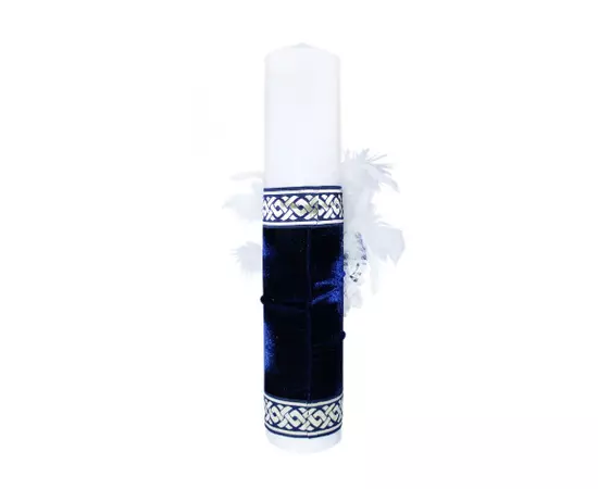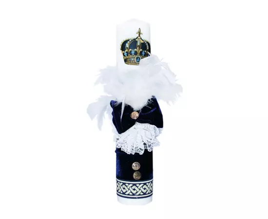 Alege o lumanare de botez cu aplicatii din pene, catifea si funda stil papion aplicata. In timpul slujbei religioase, unul dintre nasi va tine lumanarea aprinsa, flacara lumanarii simbolizand drumul pe care si-l va alege in viata copilasul.
