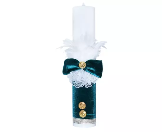 Alege o lumanare de botez cu aplicatii din pene, catifea si funda stil papion aplicata. In timpul slujbei religioase, unul dintre nasi va tine lumanarea aprinsa, flacara lumanarii simbolizand drumul pe care si-l va alege in viata copilasul.