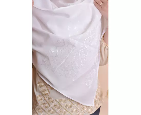 Marama traditionala alba din bumbac cu broderie alba cusuta cu fir de matase, ideala pentru a fi purtata si pe post de esarfa sau sal.