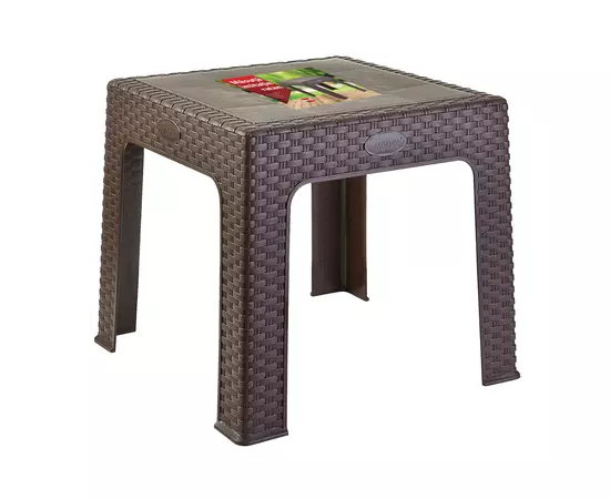Masuta poate fi utilizata in interior si exterior, are o impletitura din plastic cu design de ratan de culoare maro inchis.
