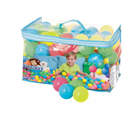 Setul contine 100 de mingi colorate realizate din plastic moale si umplute cu aer.