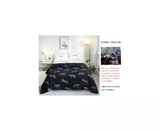 Patura Cocolino cu imprimeu, este usor de intretinut , culoare rezistenta la spalari repetate, foarte usoara, moale, flausata, si placuta la atingere. O poti folosi atat pentru decor cat si pentru a te incalzi in zilele friguroase.Daca te-ai plictisit de culoarea monotona a canapelei , poti adauga putina culoare in dormitor, o patura colorata poate fi o alegere potrivita.Alegeti acum o patura cocolino si bucurati-va de un somn odihnitor.