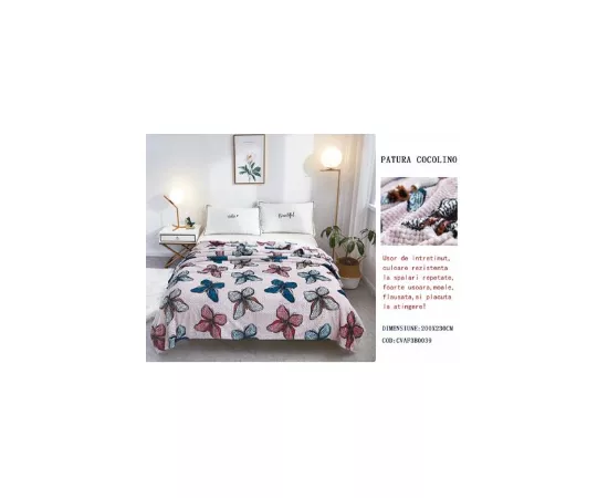 Patura Cocolino cu imprimeu, este usor de intretinut , culoare rezistenta la spalari repetate, foarte usoara, moale, flausata, si placuta la atingere. O poti folosi atat pentru decor cat si pentru a te incalzi in zilele friguroase.Daca te-ai plictisit de culoarea monotona a canapelei , poti adauga putina culoare in dormitor, o patura colorata poate fi o alegere potrivita.Alegeti acum o patura cocolino si bucurati-va de un somn odihnitor.
