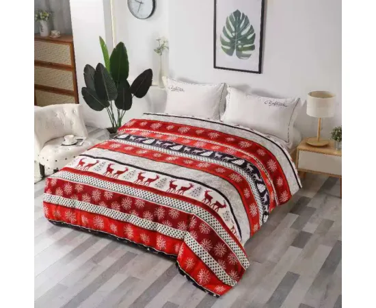 Designul specific de Crăciun este vibrant și festiv, cu elemente precum fulgi de zăpadă, reni, brăduți sau alte motive de sărbătoare, toate în culori clasice de roșu, alb, verde sau albastru, care completează atmosfera magică de sărbători. Dimensiunile generoase (200x230 cm) fac pătura ideală pentru a fi folosită pe un pat matrimonial sau pe canapea, aducând o notă decorativă aparte în locuința ta.