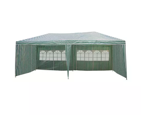 Acoperisul pavilionului si peretii laterali sunt confectionati din polietilena, care are un grad ridicat de protectie impotriva soarelui si a apei. Culoarea verde inchis in combinatie cu alb il ajuta sa se incadreze perfect intr-o gradina plina de verdeata si flori.