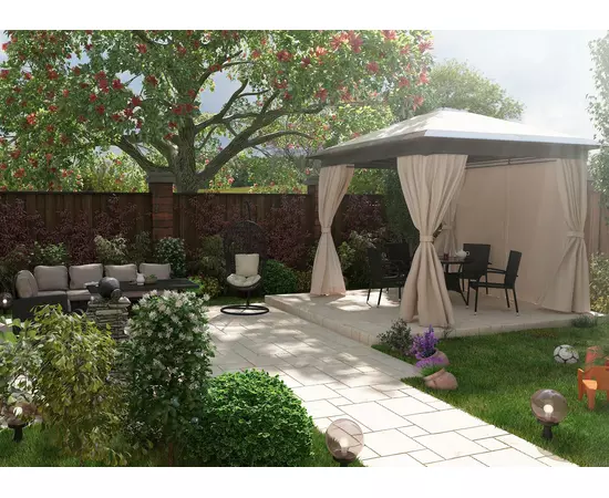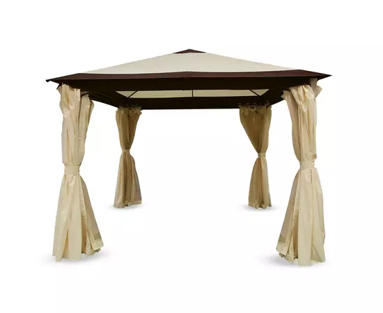 Este prevazut cu plasa impotriva insectelor si perdea pe toate laturile. Astfel, se poate acoperi de jur-imprejur, protejand de soare, vant sau precipitatii reduse. Culorile regasite sunt crem si maro inchis (pe marginile acoperisului), pavilionul avand un aspect foarte elegant, incadrandu-se cu usurinta in orice gradina sau curte.