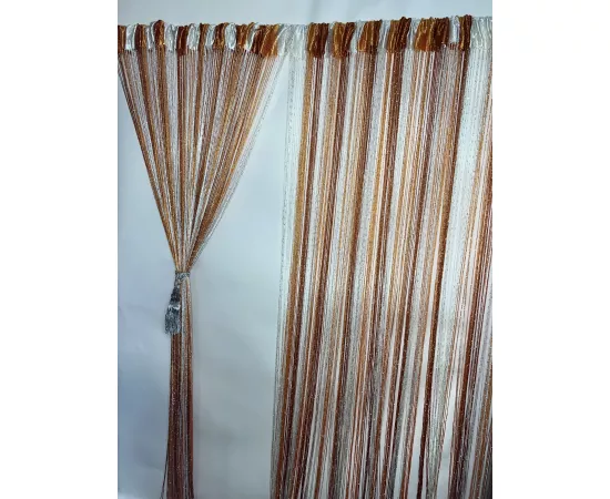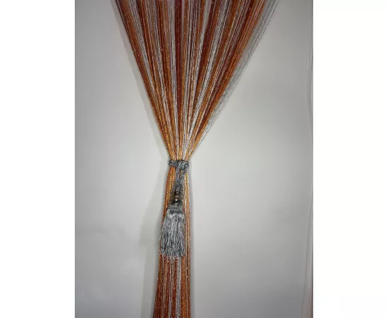 Perdea cu franjuri modernă cu insertii argintii. Poate fi agățată pe inele cu cleme sau întinsă pe galerie.