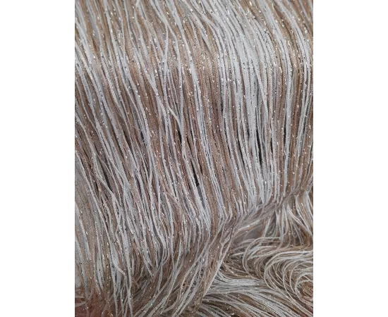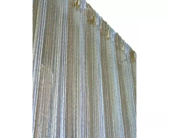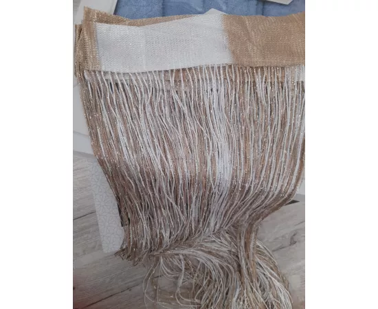 Perdea cu franjuri modernă cu insertii argintii. Poate fi agățată pe inele cu cleme sau întinsă pe galerie.