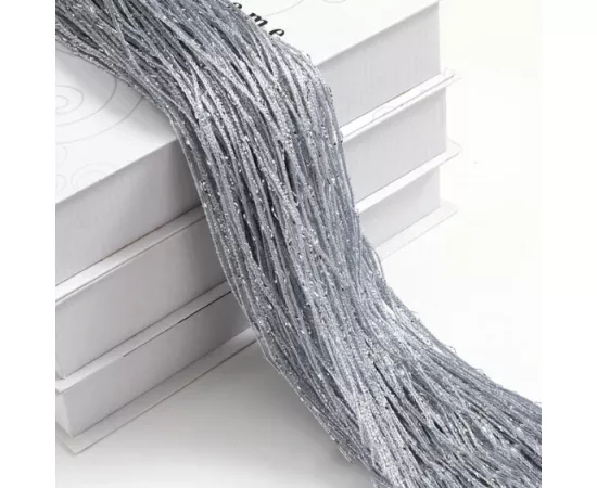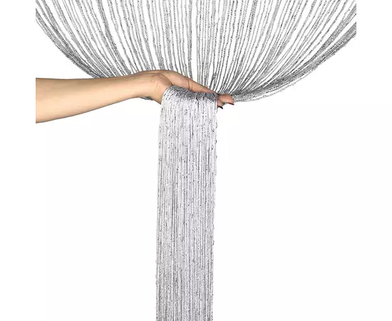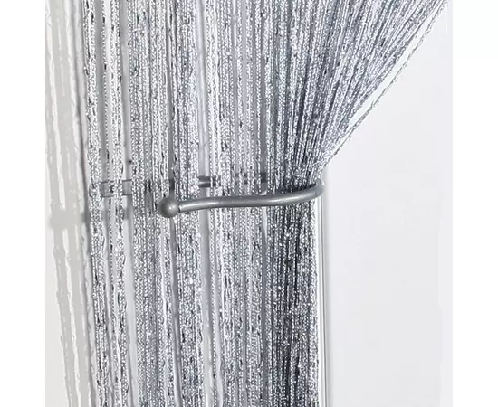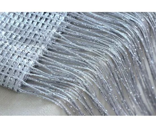 Perdea cu franjuri modernă cu insertii argintii. Poate fi agățată pe inele cu cleme sau întinsă pe galerie.