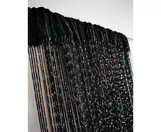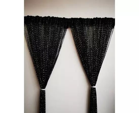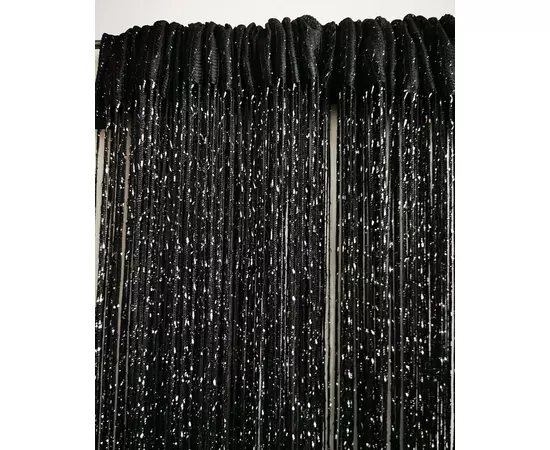 Perdea cu franjuri modernă cu insertii argintii. Poate fi agățată pe inele cu cleme sau întinsă pe galerie.