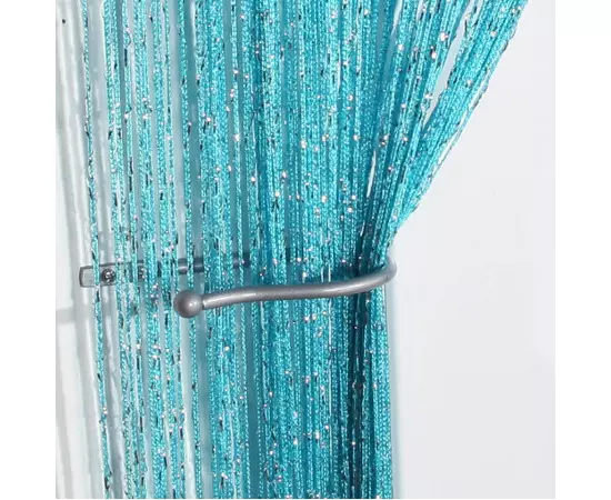 Perdea cu franjuri modernă cu insertii argintii. Poate fi agățată pe inele cu cleme sau întinsă pe galerie.