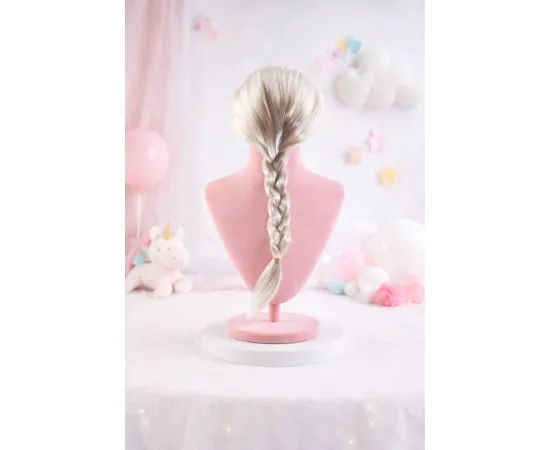 Perucă elegantă din păr sintetic de culoare blond platinat, inspirată de celebra coafură a personajului Elsa din filmul de animație „Frozen”. Modelul este prevăzut cu o împletitură lungă și bogată, fiind alegerea ideală pentru petreceri tematice, carnavaluri, evenimente speciale sau jocuri de rol pentru copii.
