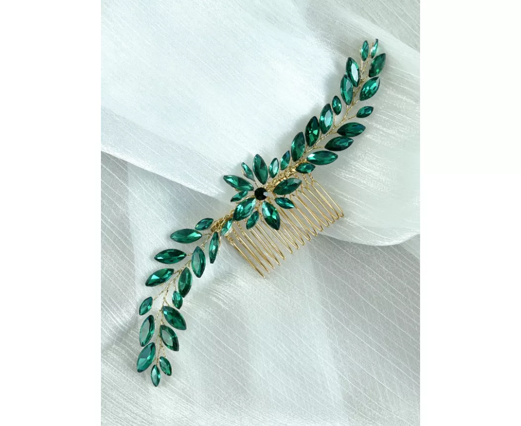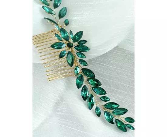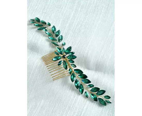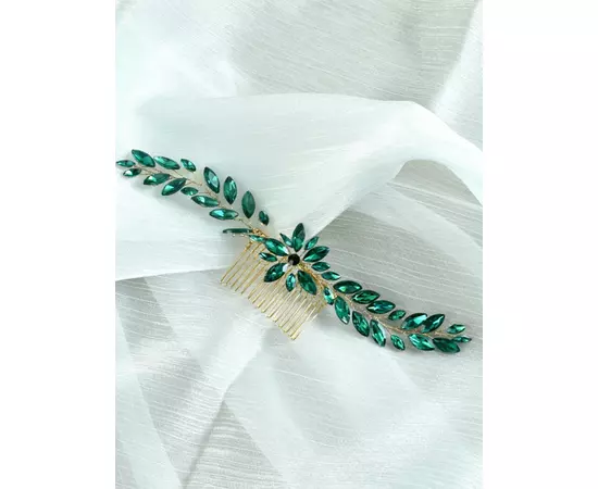 Pieptene Mireasa Auriu cu Strasuri Verzi 20x2cm - 01676